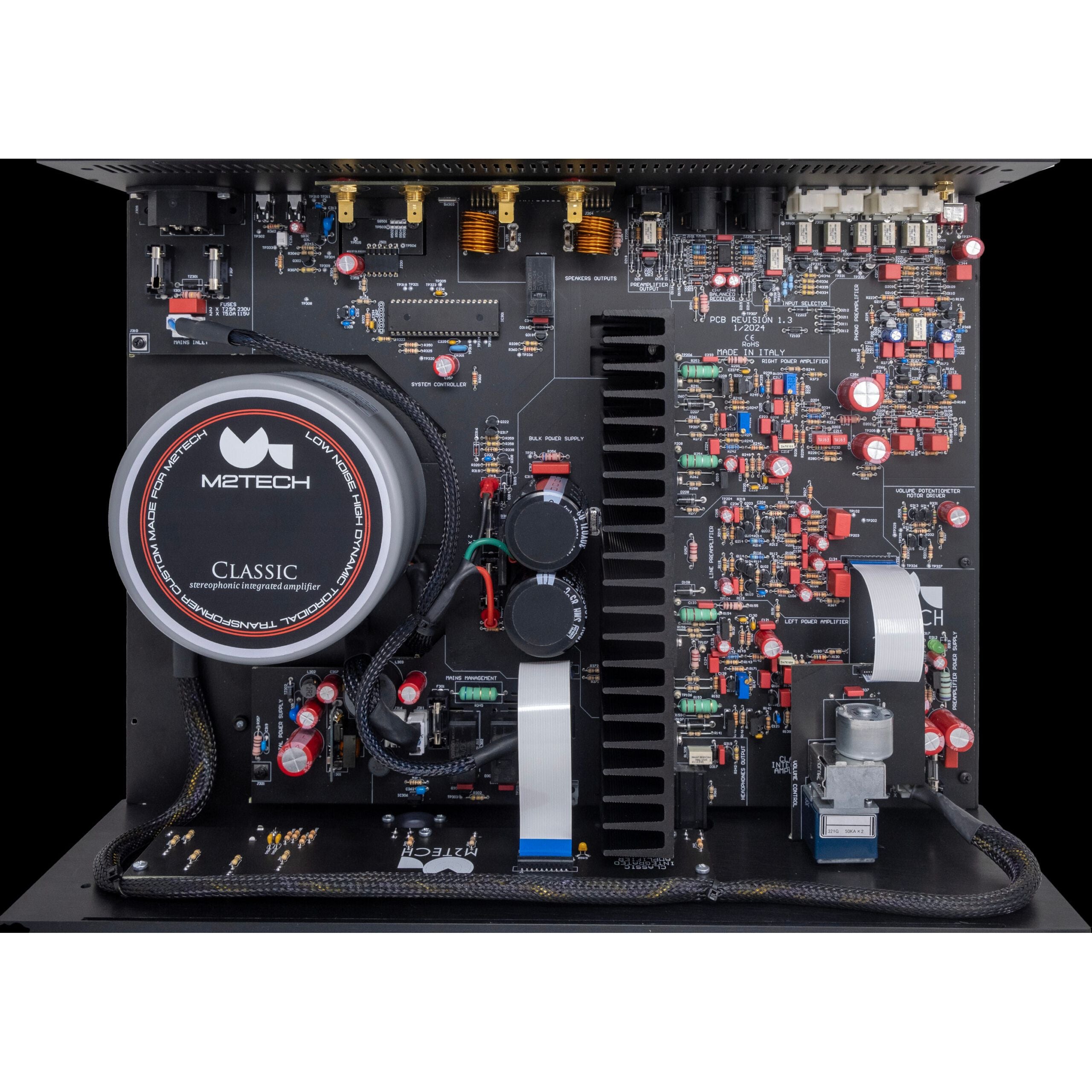 The Classic Integrated Amplifier is assembled with great care by hand in Italy, because at M2Tech we believe strongly in the added value of expert craftsmanship that gives quality to the product and dignity to the worker. It is made using only through-hole mounted components. They offer a greater variety of choices than surface-mount components. This allowed us to choose the most suitable components at the design stage according to sound and power handling, because we wanted to make a well-sounding and durable product-an investment for life.